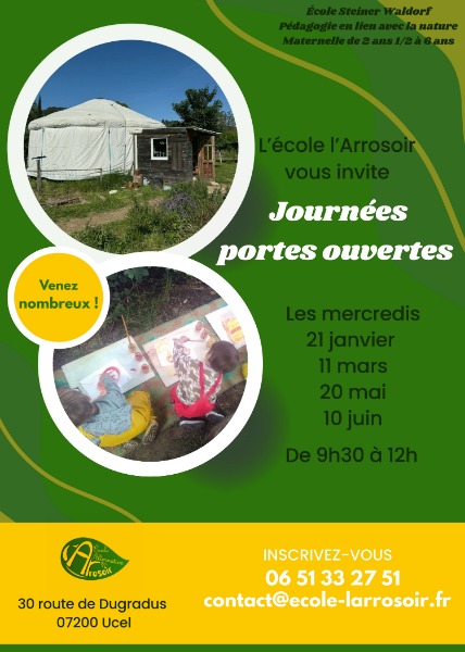 L'école maternelle l'Arrosoir ouvre ses portes mercredi 11 mars puis 20 mai de 9h30 à 12h. Venez découvrir une pédagogie par la nature, respectueuse...