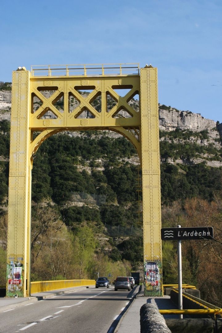 Toutefois, au bout et sous l’imposant pont jaune, coule l’Ardèche. Qui ne connaît pas le Pont de Ville, reconnaissable entre mille ? Franchissant élégamment la rivière, il permet à la route arrivant de la vallée du Rhône de pénétrer le bassin albenassien. Oui, Saint-Didier-sous-Aubenas est la porte d’entrée orientale d’Aubenas. Mais il n’en a pas toujours été ainsi. Jusqu’au début du XIXe siècle, le village était un cul de sac ; point de pont pour franchir l’Ardèche, à peine un gué qui n’était empruntable, en tout cas, pas en toute saison. La route de la vallée du Rhône passait par l’Échelette et Pont-d'Aubenas. Treize années furent nécessaires pour la construction d’un premier pont en bois où fut installé un péage afin d'en couvrir les frais… Le second pont à câbles fut achevé en 1936, après deux années de travaux. Mais en 1993, les câbles donnèrent des signes inquiétants de faiblesse, justifiant la présence de l’arche métallique. L’ensemble de l’ouvrage fut repensé pour offrir le pont actuel, inauguré le 10 juillet 1995. Déjà plus de vingt ans de bons services !