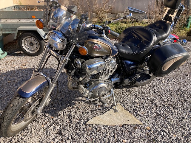vends moto YAMAHA VIRAGO 1100 cm3 année 1998 prix: 2900€ État exceptionnel Très bien entretenue, propriétaire initial Top-case, sacoche de réservoir 42000 km d'origineContrôle technique RAS