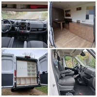 Véhicule en très bon état aménagé avec un meuble à tiroirs, une table pliante et un fauteuil 2 places dans la partie arrière ainsi qu'un placard dans le coffre.