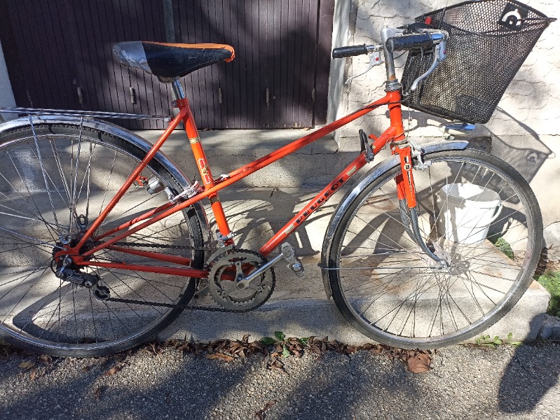 Vélo femme Orange Peugeot,vintage. Deux plateaux à l'avant, 4 pignons à l'arrière. Muni d'un panier devant, porte bagage derrière. Feux...