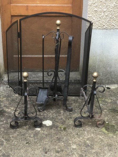 Accessoires cheminée en fer noire et boule laiton, serviteur, 2 chenets et pare feu à 3 volets hauteur 50cm. Etat satisfaisant.
