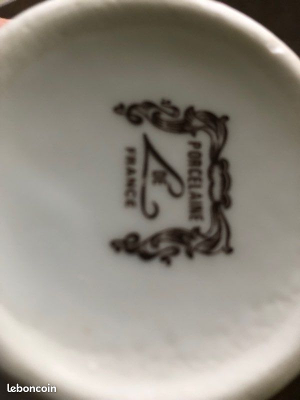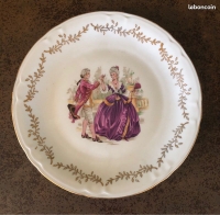 Porcelaine de France avec scène galante La Marquise de Pompadour et déco florale style Fragonard.