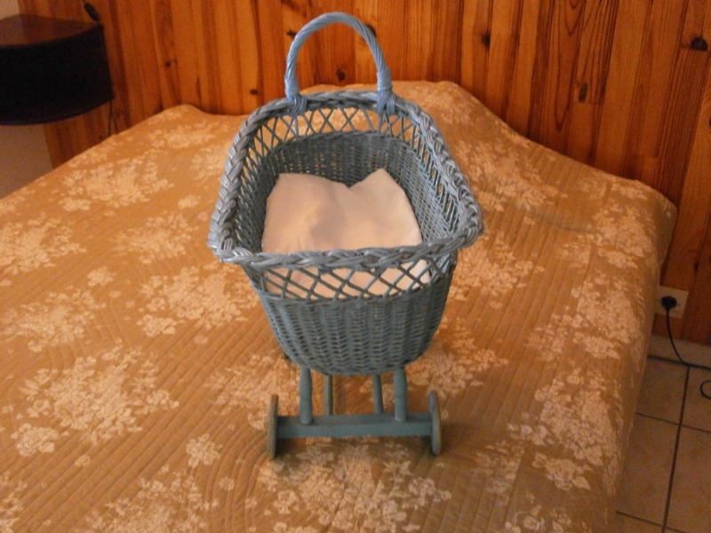 Landau poupée ancien couleur bleu,en osier sur roues en bois.Très bon état.40 euros.