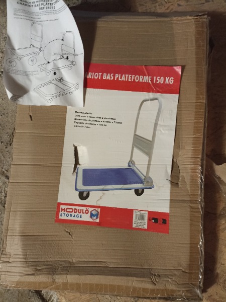 Chariot plate forme marque Modulo Dans son emballage d'origine. Manche pliable. Capacité :150 kgs 47/ 72,5 07 89 50 22 47