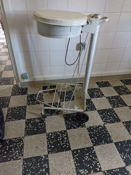 de garage metal blanc à pédales pour sac poubelle 100l.grosse élastique pour fixer le sac 4 roulettes Peinture un peu abîmée