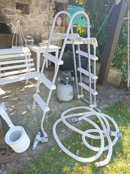 Cause déménagement : matériel complet pour piscine hors sol INTEX 10 m3( sauf piscine)Échelle, skimmer, crepines, tuyaux, nombreux joints caoutchouc, produitsFiltre à sable, moteur.etc....Tout n'est pas visible sur les photos.07 89 50 22 47