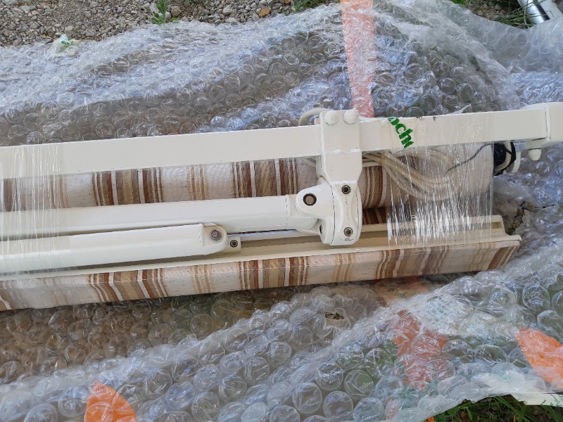 Store Banne A servi 1 Eté Ouverture motorisée avec télécommande Montage mural par 4 fixations. Armature blanche Toile doublée couleur crème et marron clair avec rayures Auvent de dimension L 500 cm x P 350 cm Possibilité de transport, devis sur demande.