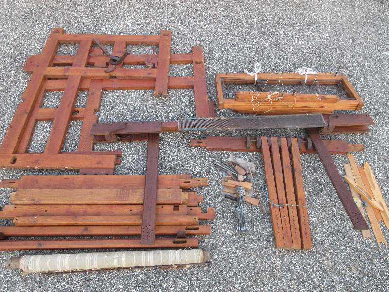 MÉTIER À TISSER d'artisan en épicéa. Démonté. Système à la lève Largeur de tissage 100 cm 4 cadres, 4 pédales Battant équipé d'un lance navette...