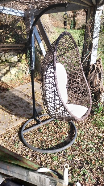 Fauteuil de terrasse suspendu .couleur marron structure metallique habillee sur Potence tubulaire noir(démontable pour transport) , +2 coussins...