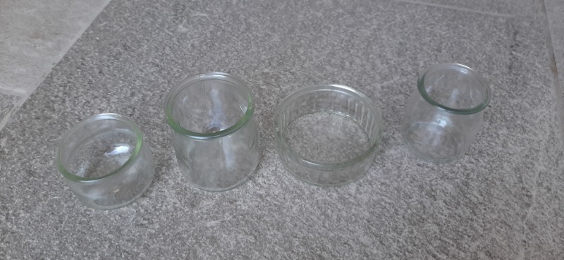 vend petits pots et ramequins en verre propre (nettoyés ) pour desserts ou verrines 110 pots modèle haut - 28 pots modèle moyen - 43 pots petit...