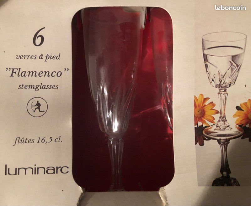 Lot de verres neufs Luminarc dans leurs emballages Gamme Flamenco Verres à eau 12 Verres à vin 8 Flûtes 10 Autres Photos dispos Remise en main propre...