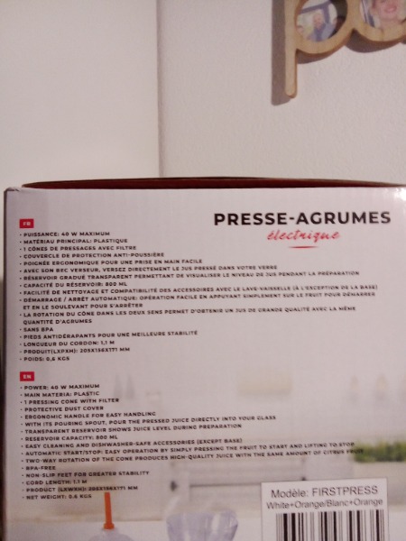 PRESSE AGRUMES ELECTRIQUE Marque : KITCHENCOOK Puissance : 48 W Capacité : 800 ml Neuf dans son emballage.