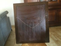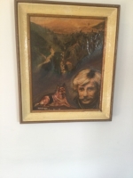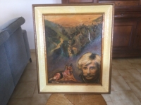 Tableau représentant Jean Ferrat avec son Chien Oural devant Entraigues s/Volane. 50,5 x 40,5 cm. Peintre Ranchon