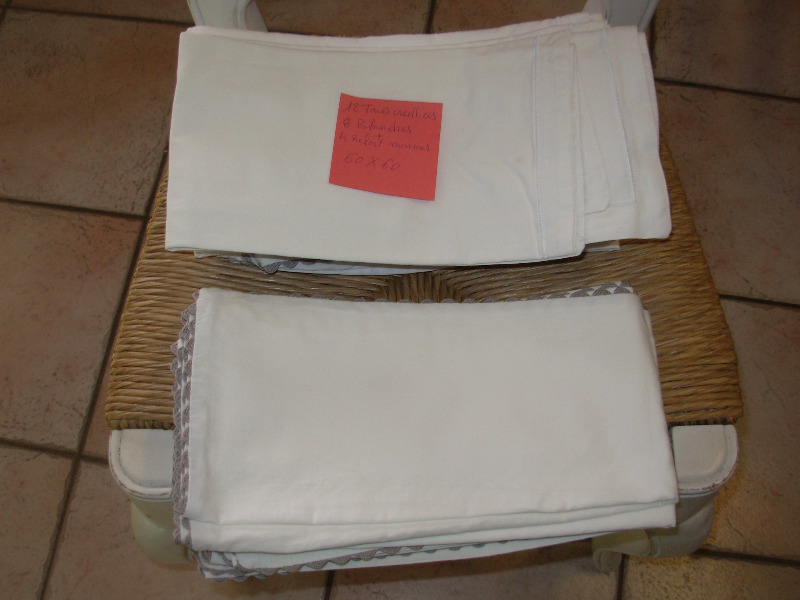 vends 4 housses de couette blanche en 140 , 4 draps housse blanc en 140 , 3 draps plat blanc en 140 , 4 housses de couette en 90 , 4 draps housse en 90 , 4 draps plat en 90 , 6 taies oreiller couleur gris 40x45,4 taies oreiller avec frou frou blanche 40 x 45, 8 taies oreiller blanche 40x45 , 12 taies oreiller 8 blanche 60x60 et 4 blanche avec liseret marron 60x60 en très bon état , idéal pour gites .
