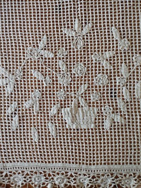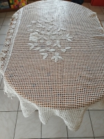 Trés beau couvre lit d'angle ou cosyFait entièrement à la main Coton blancDim: largeur :100 cm Longueur: 204 cmPrix : 25 eIl manque qqs pompoms d'où le prix