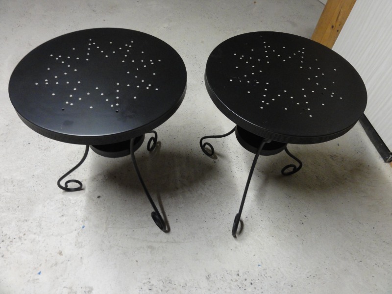 Lot de 2 petites tables métalliques noires Diamètre 50cm Hauteur 65 cm environ Très bon état. Démontées montage facile