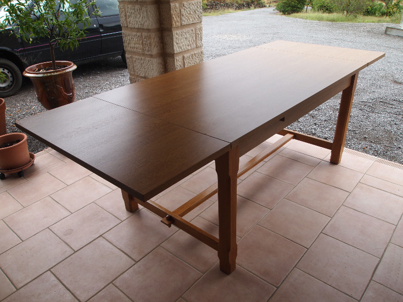 Table dite "de ferme", pieds bois, plateau bois avec parement mélaminé, dimension 150x90cm (longueur portée à 230 cm les 2 rallonges déployées). Huit...