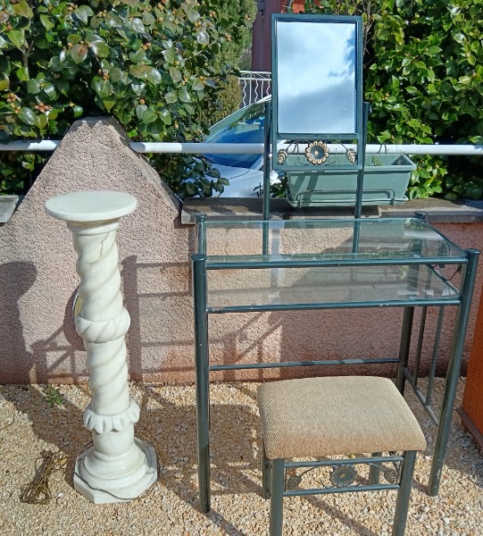 Colonne lumineuse en albâtre : H 1.00m Coiffeuse avec miroir en fer forgé et verre H avec miroir : 1,60m H plan de travail 0,90cm L : 82cm et...