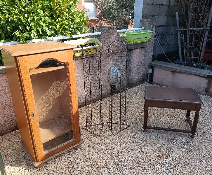 Petit meuble bois vitrine 1 porte H:1,10cm, L: 0,54cm, P: 0,45cm Petite table de salon ou chevet en bois. H: 0,47cm , L: 0,60cm, P: 0,40cm 2 colonnes...