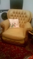 Vends beau salon en cuir et bois , robuste. Assise large. Couleur écru..En bon état. A retirer sur place. Deux fauteuils et un canapé.