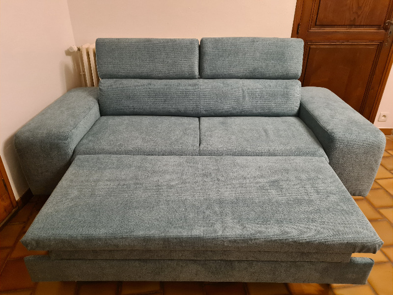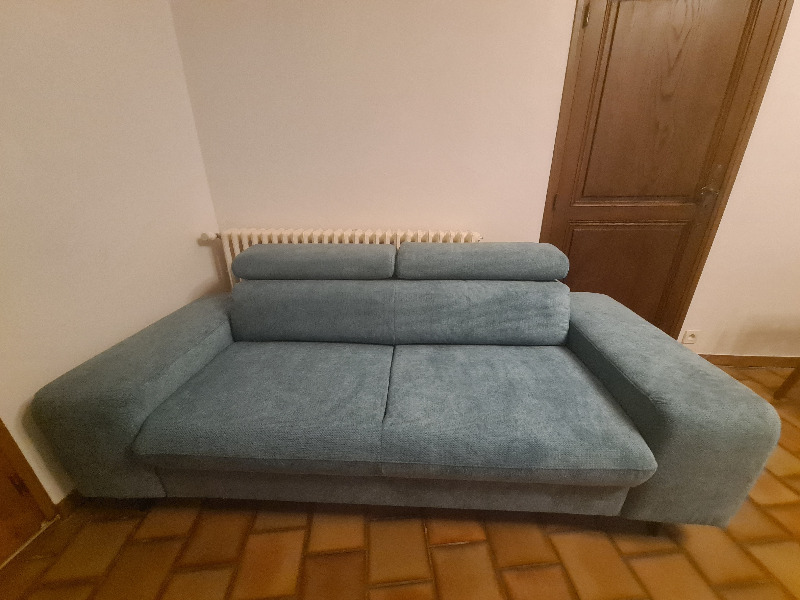 Canapé 3 places comme neuf avec têtières réglables et repose piedsModèle Emma couleur turquoise Assise : mousse polyuréthane de densité 25 ; 38 kg/m³L.217 - H.81 - P.100