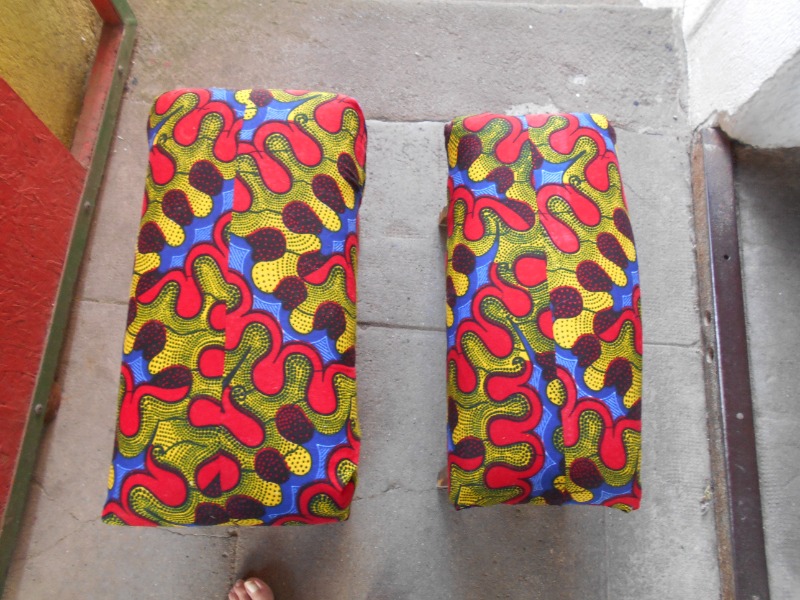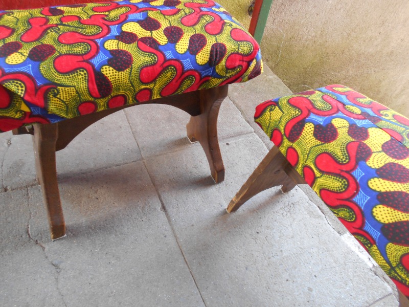 vends , lot de 2 anciens tabourets avec son joli tissus wax, ses dimensions sont : longueur : 47 cm , largeur : 20 cm et sa hauteur : 39 cm .pour le plus petit , longueur : 47 cm , largeur : 23 cm et sa hauteur : 43 cm , pour l ' autre .le prix du lot est de 70 euros . cordialement .