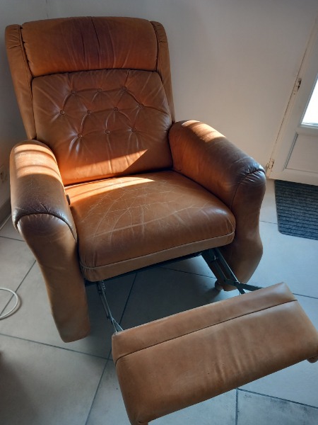 Fauteuil relax en cuir marron, inclinable, repose pieds, en l'état 30€, +housse grise.