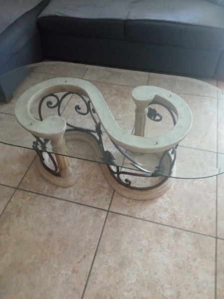 vend table basse salon en verre, pierre et fer.