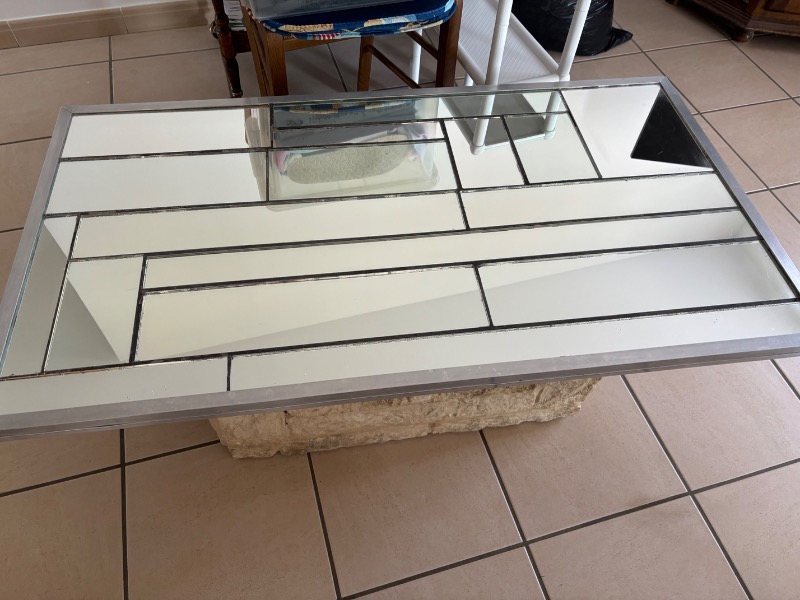 Vends table basse vitrée avec tiroir imitation pierre. Très bon état.