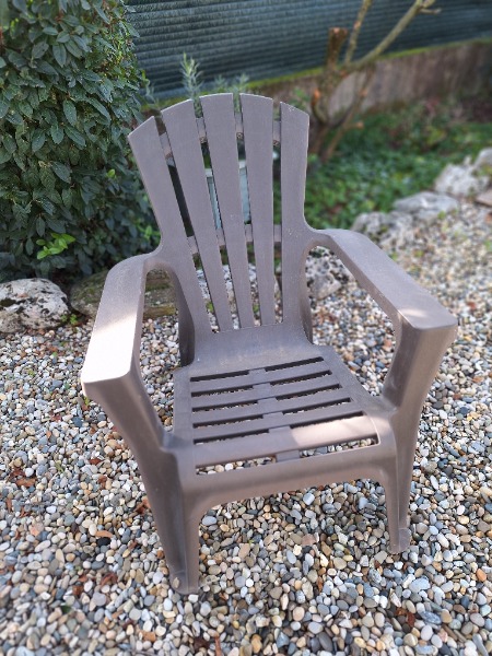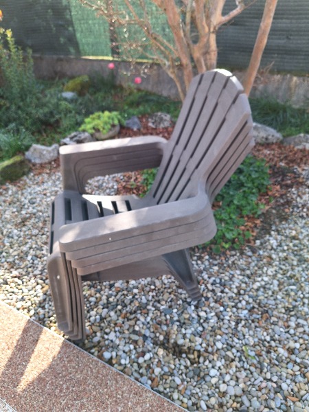 4 fauteuils extérieurs empilables hauteur sol haute du dossier 80 cm et devant 54 cm couleur marronle pingouin est aussi en vente 60 euros