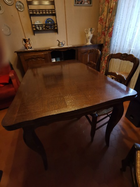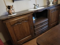 Meuble sàm: bahut bas 2 portes ornées d'une coquille, 3 tiroirs. Niche-table 8 personnes + 2 rallonges. 6 chaises en paille, années 60 en chêne foncé. TBE