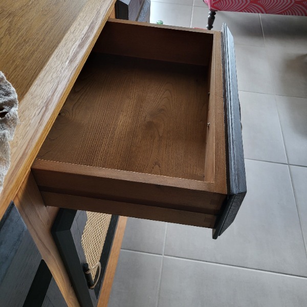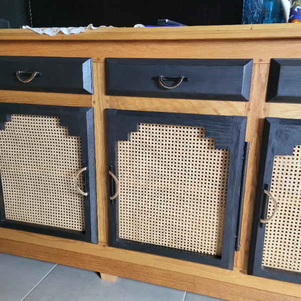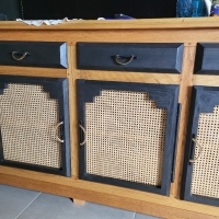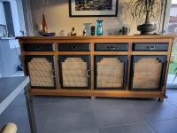 meuble de salle à manger, grande capacité, en chêne massif.Meuble relooké par un pro.Il est totalement demontable.4 portes et 4 tiroirs.Dimensions Long 230 cm / largeur 50 cm / Hauteur 103 cm.
