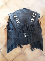 Vends gilet cuir noir avec franges, sans manche. Taille M, très bon état.