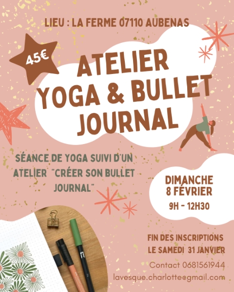 Atelier Hatha yoga et bullet journal. 1h de Hatha yoga, suivi de 2h d'atelier autour du Bullet journal. Le bullet journal est un outil d’organisation...