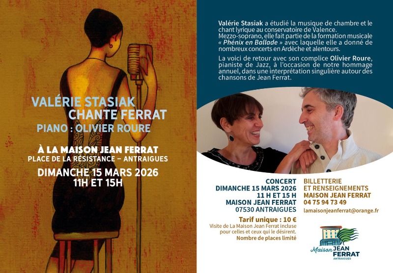 À la maison Jean Ferrat deux récitals en hommage à l'artiste le dimanche 15 mars à 11h et 15h. Au piano, Olivier Roure au chant, Valérie Stasiak. Des...