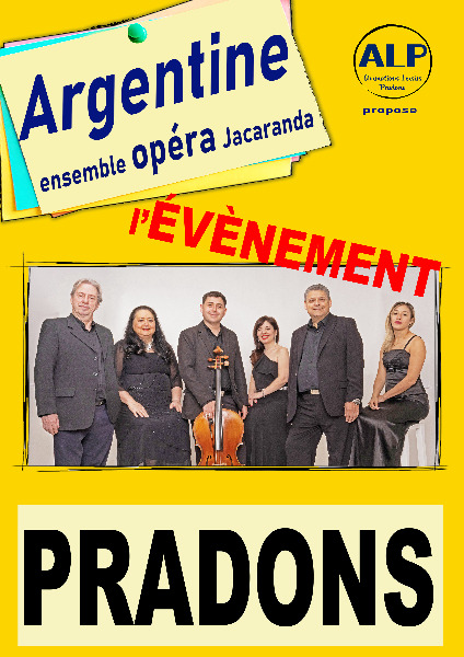 Pradons, jeudi 5 mars, 18h30, salle polyvalente. Concert exceptionnel-Chansons traditionnelles d'ARGENTINE avec des voix d'opéra. Du tango au...
