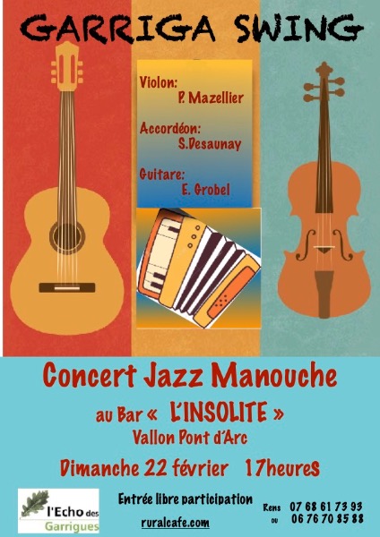 Dimanche 22 février VALLON PONT D'ARC Bar l'INSOLITE rue du Miarou 17H GARRIGA SWING TRIO Jazz Manouche Des standards du jazz manouche revisites...
