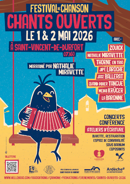 FESTIVAL DE CHANSON : "CHANTS OUVERTS" LE 1ER ET 2 MAI À ST-VINCENT-DE-DURFORT Festival d'auteurs compositeurs interprètes avec Zouick, Nathalie...