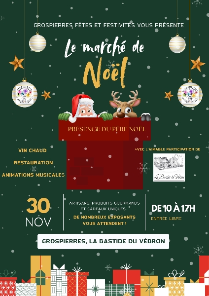 Plongez dans la magie de Noël à Grospierres. Artisans, gourmandises, lumières et bonne humeur au rendez-vous ! Quand ? le 30/11/2025 de 10 à 17 h, Où ? à la bastide de Vébron. Nous vous y attendons nombreux ! !