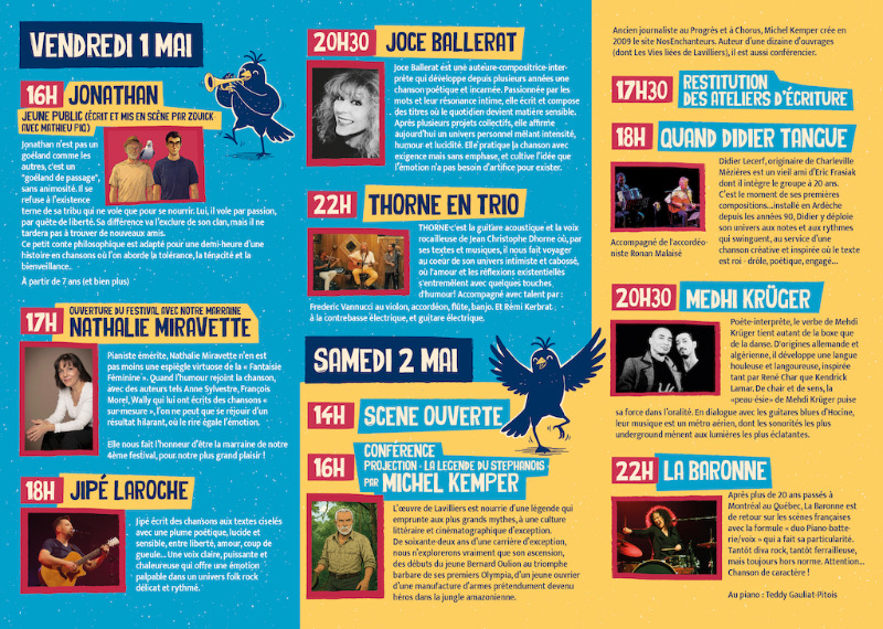 Festival d'auteurs compositeurs interprètes avec Zouick, Nathalie Miravette, Thorne, Jipé Laroche, Joce Ballerat, Quand Didier Tangue, Medhi Krüger et La Baronne.